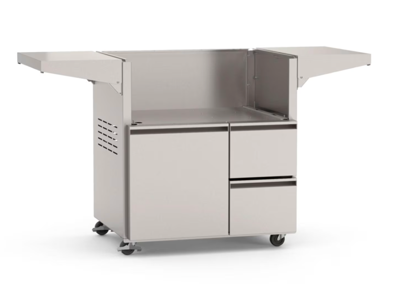 Crafted from heavy-duty 304 stainless steel, the cart withstands the elements while enhancing your outdoor kitchen’s look. Smooth-rolling casters allow effortless mobility, while twin fold-down side shelves provide ample prep space that tucks away when not in use. Soft-close drawers and a spacious access door ensure organized storage for tools, utensils, and propane, giving you the freedom to focus on grilling like a pro.