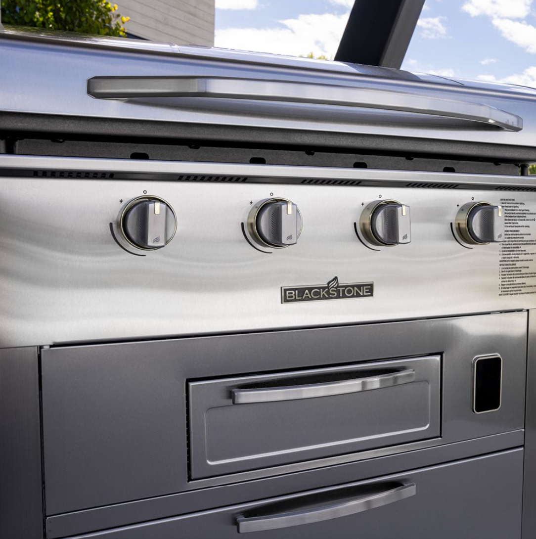 With four independently controlled heat zones, you can cook multiple dishes at different temperatures simultaneously. The dual extendable side tables provide an impressive 1,500 sq. in. of prep space, while the extra-large storage drawer with soft-close hinges keeps your tools organized and within reach. Built from 304-grade stainless steel with brass accents, this premium combo is as stylish as it is durable.