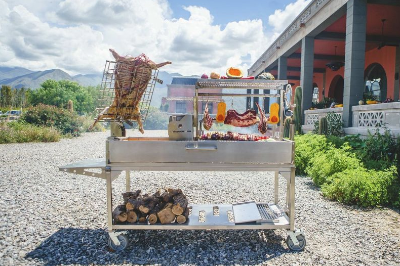 The BBQ26SS Santa Maria Grill is a high-performance open-fire cooking station built entirely from #304 stainless steel for unmatched strength and durability. Offering a massive 2,600 sq. in. of grilling space across five distinct areas — main adjustable grate, secondary grate, clamp grill, griddle, and roofing grill — this model is engineered for serious gaucho-style grilling.