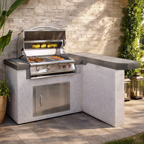 - Durable Finishes – The countertop is available in standard porcelain tile or optional natural stone tile. Base finishes include Standard Stucco (Trowel Finish) for long-lasting weather resistance, with optional upgrades to Ameristone Stucco, Elite Cabinet Siding, Cultured Stone, or Gen Stone (Faux Stone).
