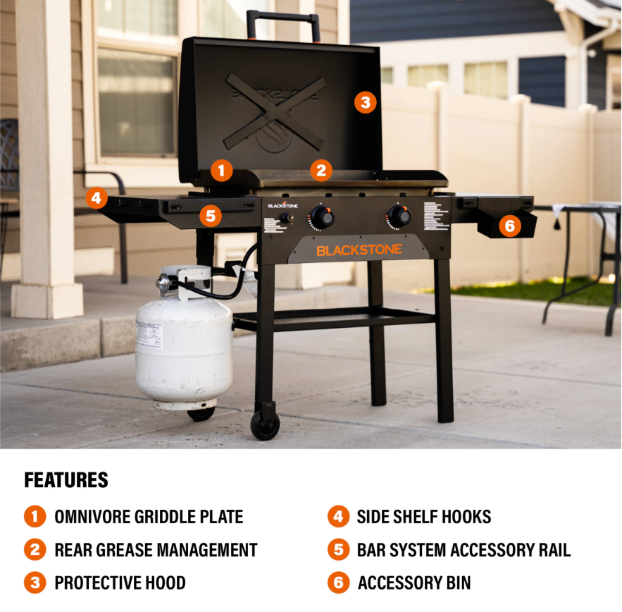Cook to your fullest potential with the Blackstone Original 28-Inch Griddle with Hood, engineered with Omnivore Griddle Plate Technology so you’ll cook more and wait less. Designed for efficient heat performance and everyday convenience, this griddle features dual heat zones, a reinforced hood for surface protection, and smart storage and cleanup solutions that make outdoor cooking easier and more enjoyable.