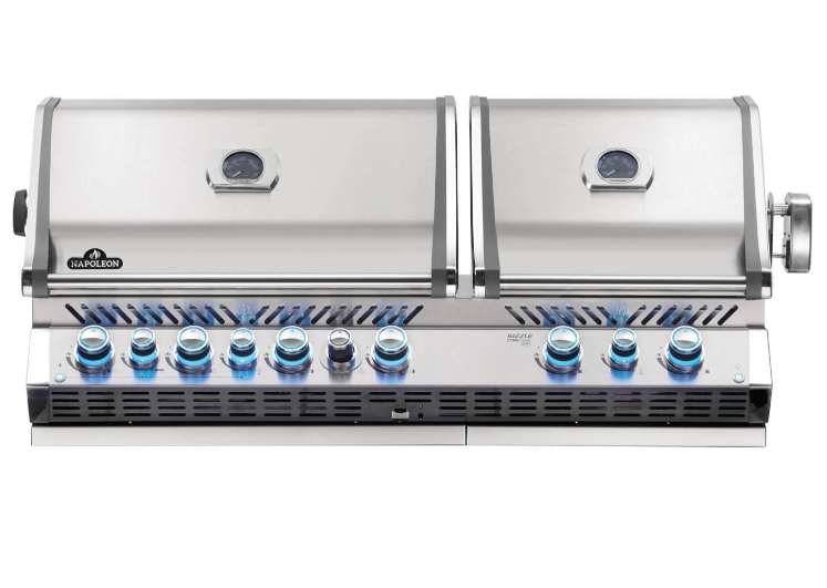 The Built-in Prestige® PRO 825 Propane Gas Grill is Napoleon’s most commanding luxury grill—designed for serious entertainers and outdoor kitchen builders. With 106,000 total BTUs, two fully independent grill heads, and an expansive 1,245 sq. in. total cooking area, this unit gives you unmatched flexibility for simultaneous direct searing, low-and-slow indirect cooking, and professional rotisserie roasting. The infrared rear rotisserie burner with included spit kit delivers perfectly even, restaurant-quality results, while the integrated wood chip smoker tray lets you add authentic smoke flavor at the turn of a knob. Iconic 9.5 mm stainless WAVE™ cooking grids create bold sear marks and exceptional heat retention, and premium stainless construction with chrome accents ensures lasting durability and elegance. Grill confidently after dark thanks to interior grill lights, proximity lighting, and RGB Spectrum NIGHT LIGHT™ knobs with SafetyGlow, which illuminate blue and turn red when burners are active for added safety and control.