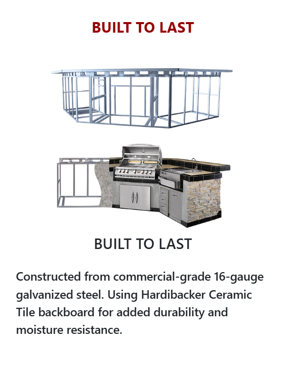 Durable Finishes – Countertop options include granite, porcelain tile, or natural stone tile. Base finishes available in Ameristone Stucco or Cal Stone styles for long-lasting weather resistance.