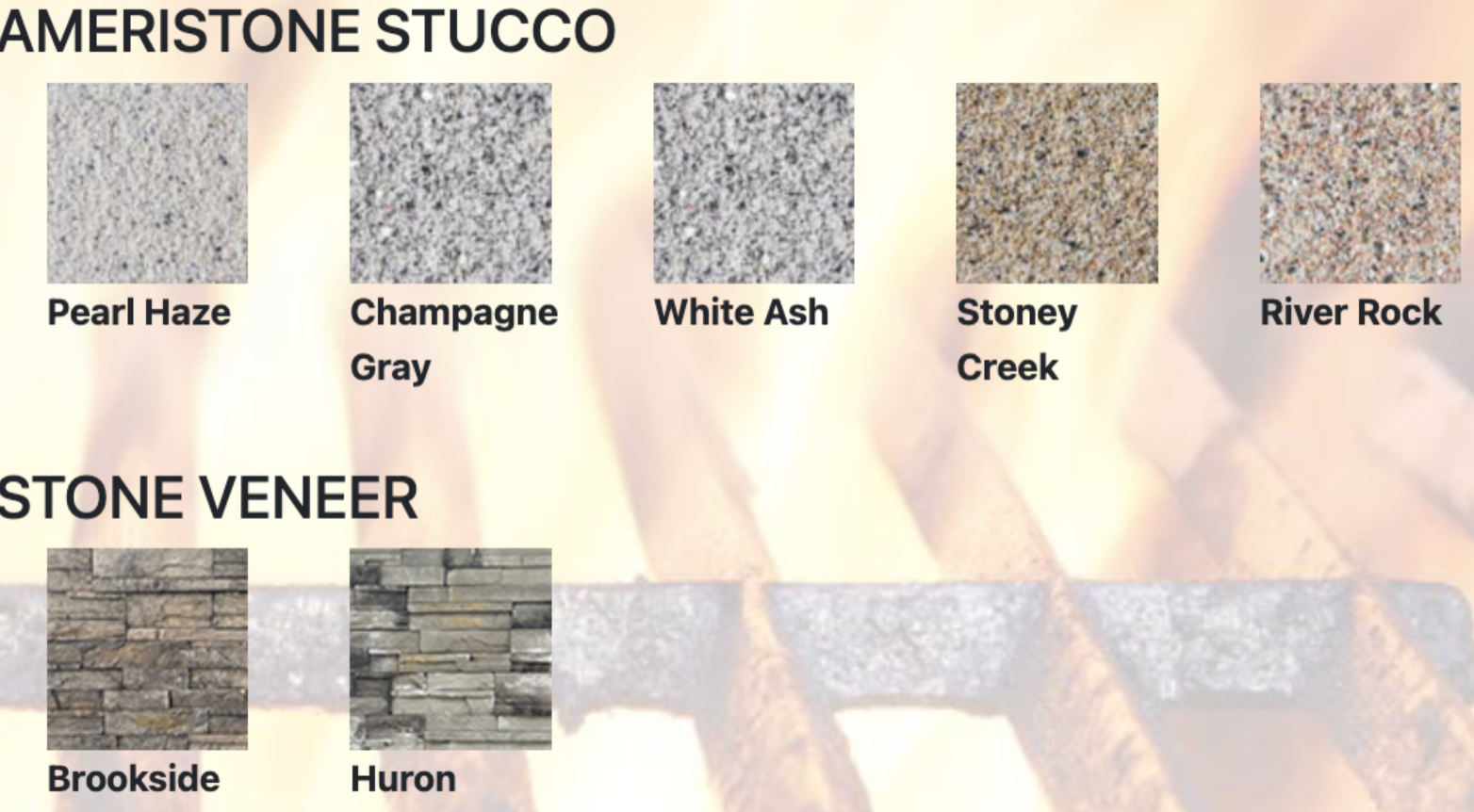 Custom Finishes – Granite, porcelain tile, or natural stone countertops; Ameristone Stucco or Cal Stone base options.