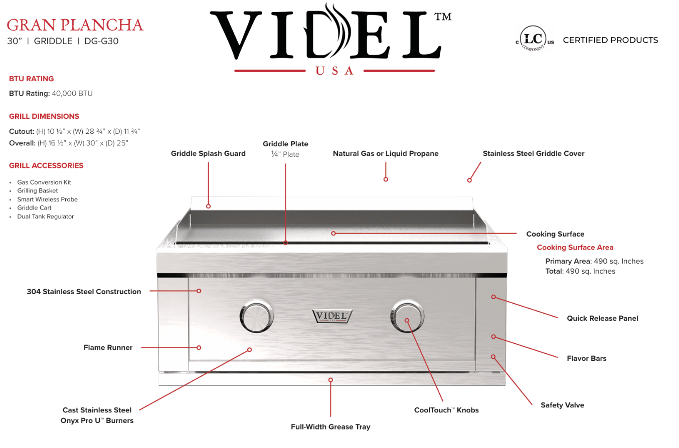 | Griddle: | Gran Plancha with independent adjustable burners & multi-zone control |