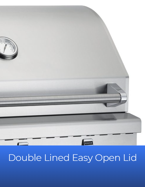 Standard features include a double-lined easy-open lid, retractable warming rack, multi-level stainless steel cooking grids, Flare Control Vaporizer to reduce flare-ups, and Heat Zone Dividers for precise temperature control. Interior cooking lights, illuminated control knobs, flame thrower ignition, and an easy slide drip tray enhance usability. This grill comes ready for natural gas use and includes a conversion kit for easy setup with liquid propane.